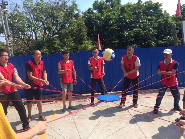 團(tuán)隊(duì)在當(dāng)天上午9點(diǎn)半左右到達(dá)目的地,經(jīng)過短暫的休息后,進(jìn)行了分組團(tuán)隊(duì)建設(shè)及熱身小活動(dòng)。緊接著,作為活動(dòng)的第一個(gè)項(xiàng)目“無軌列車”隆重登場(chǎng)了,本項(xiàng)目要求團(tuán)隊(duì)成員雙腳分別站在兩塊長(zhǎng)約5~8米,安裝有10個(gè)提繩的長(zhǎng)條木板上并手握提繩,行走一定的距離。由于剛開始大家沒有找到項(xiàng)目的技巧,舉步難行,兩隊(duì)都是東倒西歪,經(jīng)過磨合溝通后,最終順利地完成了比賽。該項(xiàng)目提升了團(tuán)隊(duì)激情及凝聚力。