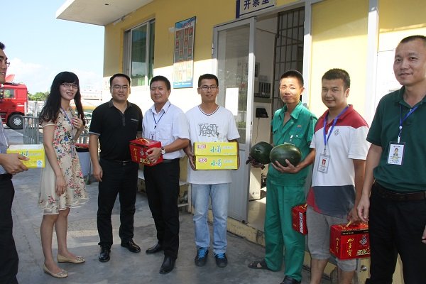 2014年7月29日,由集團(tuán)總裁辦、人力資源中心組成的高溫慰問團(tuán)代表集團(tuán)進(jìn)行莆田區(qū)域的高溫慰問活動(dòng),為在戶外高溫作業(yè)的一線員工送去消暑慰問品,曠遠(yuǎn)能源股份有限公司副總經(jīng)理黃劍鋒陪同慰問。