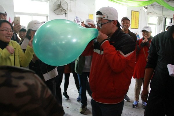 吃過午飯后,經(jīng)過一個小時的休息,拓展活動繼續(xù)進行。下午的第一個活動為“牛皮吹破天”,要求各小組將所發(fā)全部氣球吹爆,總計時間最短的小組獲勝。裁判根據(jù)氣球頭數(shù)量核實戰(zhàn)績。游戲開始時,各小組的男士們紛紛發(fā)揮紳士風度,爭分奪秒,氣球爆炸聲此起彼伏,為了加強娛樂性,裁判組分別給每個小組分發(fā)一個大氣球,每次大氣球的吹爆過程都能引來隊員們的側目相看,隊員們臉上露出各異的表情,或驚奇,或興奮,或賊笑……